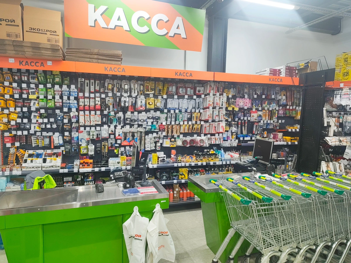 Зона выгрузки товара находится с левой стороны от центрального входа в магазин.