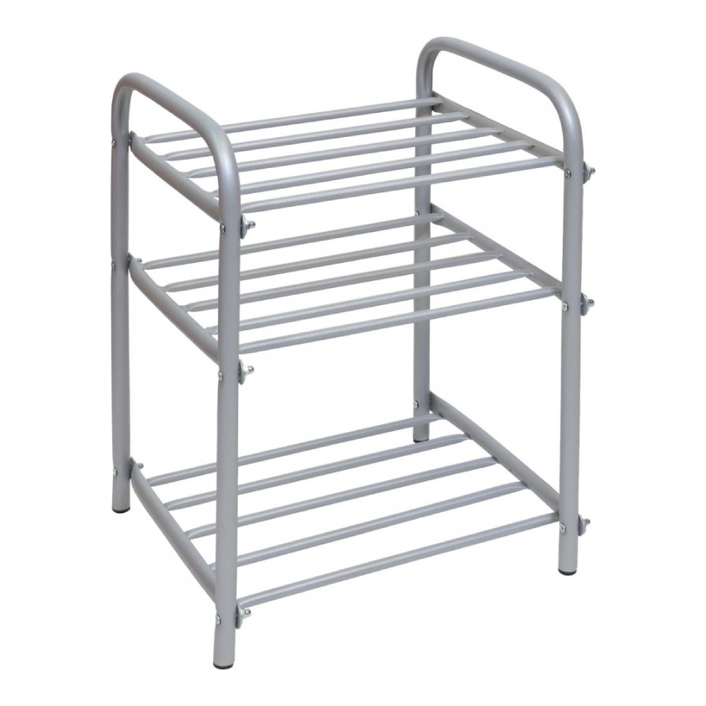 Этажерка для обуви, разборная - напольная подставка для обуви. Имеет 3 надёжные полки для размещения обуви, усиленный металлический каркас. Покрытие каркаса этажерки устойчиво к механическим воздействиям. Пластиковые колпачки на ножках защищают поверхность пола от царапин. Допустимая нагрузка не более 20 кг. Конструкция этажерки разборная.