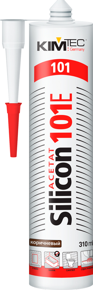 Силиконовый герметик «KIM TEC Silicon 101E — универсальный силиконовый герметик и клей ацетатного отвердения для уплотнения и склеивания непористых поверхностей. Обеспечивает долговечность соединений, так как он является устойчивым к изменению температуры от -30°С до +120°С, ультрафиолетовому излучению; благодаря фунгицидным добавкам, устойчив от разных бактерий, грибков и т. п. Короткое время отвердения продукта позволяет выполнять монтажные работы в быстром темпе.