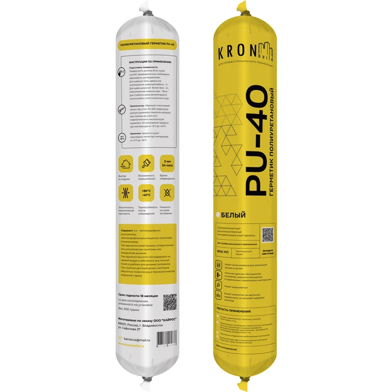 Полиуретановый герметик Kronbuild, PU-40, белый, 600 мл - высококачественный однокомпонентный клей-герметик, созданный на основе полиуретана, и служащий для соединений различных строительных конструкций, в том числе подверженных высоким динамическим нагрузкам, а также герметизации швов: