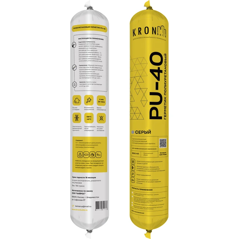 Полиуретановый герметик Kronbuild, PU-40, серый, 600 мл - высококачественный однокомпонентный клей-герметик, созданный на основе полиуретана, и служащий для соединений различных строительных конструкций, в том числе подверженных высоким динамическим нагрузкам, а также герметизации швов: