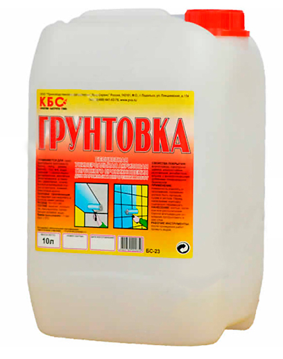 Грунтовка универсальная КБС БС-23 глубокого проникновения, 10 л применяется предварительной грунтовки по бетону, гипсу, дереву, кирпичу, под все виды покрытий - краски воднодисперсионные, масляные, эмали алкидные, а так же для укрепления осыпающихся и мелящихся старых штукатурок, клеевой, известковой краски. Грунтовка проникающая не содержит растворитель и почти не имеет запаха.