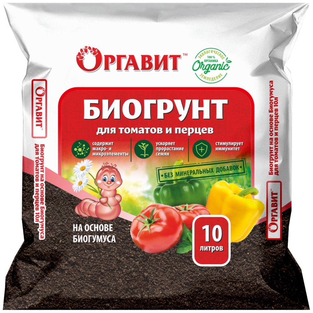 Биогрунт на основе Биогумуса "Для томатов и перцев", 10 л - способствует улучшению плодородности и структуры почвы, восстанавливает ее после истощения. Усиливает регенерационные процессы, увеличивает сопротивляемость растений к бактериальным и грибковым заболеваниям. Способствует стабильному росту крепкой и здоровой рассады. Повышает всхожесть семян и приживаемость рассады.