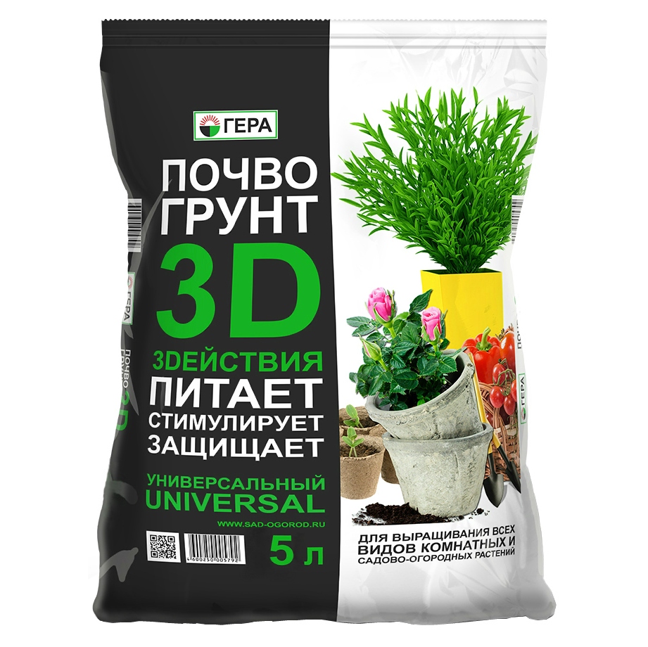 Грунт 3D ГЕРА Универсальный 5 л - полностью готовый к применению грунт для выращивания овощных и цветочно-декоративных растений в открытом грунте (в качестве основной заправки гряд, клумб, альпийских горок и других цветников) и закрытом грунте (в теплице, зимнем саду, комнатном цветоводстве); посадки плодово-ягодных и декоративных деревьев и кустарников; проращивания семян; выращивания овощной и цветочной рассады; выгонки луковичных растений; мульчирования (укрытия) почвы под растениями; посадки, пересадки, подсыпки или смены верхнего слоя почвы у растущих растений.