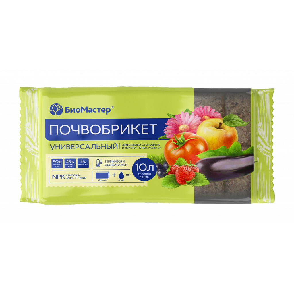 Почвобрикет БиоМастер, универсальный, 10 л - прессованный почвобрикет изготовлен из натуральных компонентов с оптимальной структурой, которая обеспечивает отличный баланс влажности и воздуха. Идеально подходит для выращивания всех видов садово-огородных и комнатных растений, обеспечивает равномерный рост и здоровье растений, обильное цветение и хорошую урожайность. Особая структура почвы обеспечивает равномерное распределение влаги, воздуха и питательных веществ по всему объему горшка. Длительное время почвосмесь сохраняет рыхлую структуру и не слеживается. Почвосмесь абсолютно безопасна, не содержит болезнетворных грибков и вредителей.