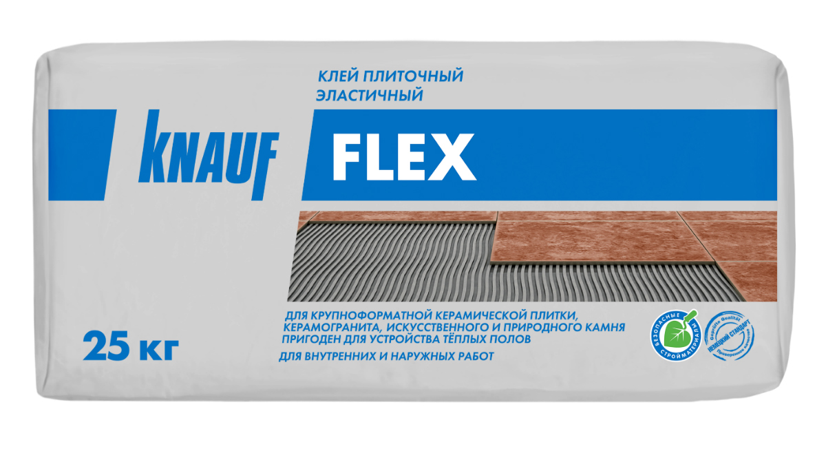 Клей плиточный KNAUF FLEX (Кнауф-Флекс) - универсальная сухая смесь на цементной основе с повышенной эластичностью и адгезией. Продукт выпускается с постоянным внутренним и независимым (сертификация ГОСТ Р) контролем. Предназначен для работ с не впитывающей керамической плиткой, для облицовки стен и пола керамической плиткой, природным и искусственным камнем (керамогранит). Может применяться для крепления изоляционных материалов (пенополистирола, минеральной ваты и т.п.). Особенно рекомендуется для облицовки поверхностей с повышенными нагрузками (полы производственных помещений), поверхностей, подверженных колебаниям температуры (террасы, балконы, отапливаемые полы), а также для применения на деформируемых основаниях (ЦСП) и при облицовке плиткой по плитке.