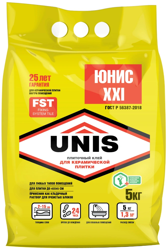 Клей плиточный "Unis - ХХI" - плиточный клей для укладки керамической, кафельной, мозаичной плитки. Применяется для укладки всех видов керамической плитки с нормальным водопоглощением (более 5%) размером до 45х45см на полы и стены внутри сухих, влажных, отапливаемых и неотапливаемых помещений. Клей может применяться как клеевой кладочный раствор для укладки блоков на основе ячеистого бетона (пено- и газобетона, а также газосиликата).