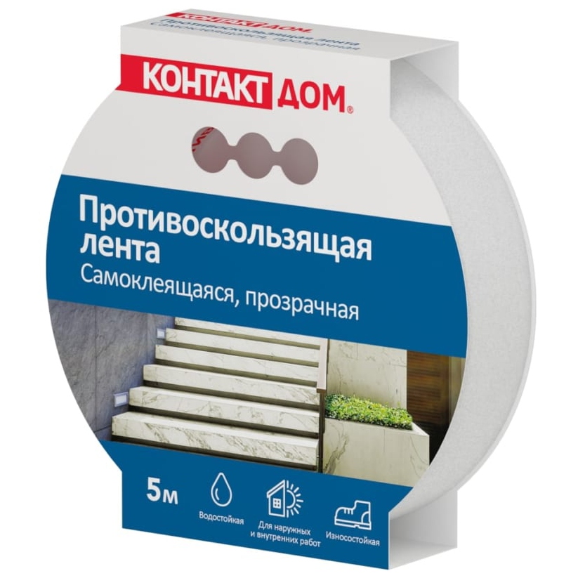 Лента противоскользящая Контакт Дом, самоклеящаяся, 25 мм х 5 м применяется для предотвращения скольжения на ступенях лестниц, в ванных комнатах, вокруг бассейнов и в других местах с повышенной влажностью. Обладает стойкостью к воде, УФ, перепадам температур и чистящим средствам. Надежно фиксируется на материалах: кафель, камень, металл, дерево, пластик, бетон.