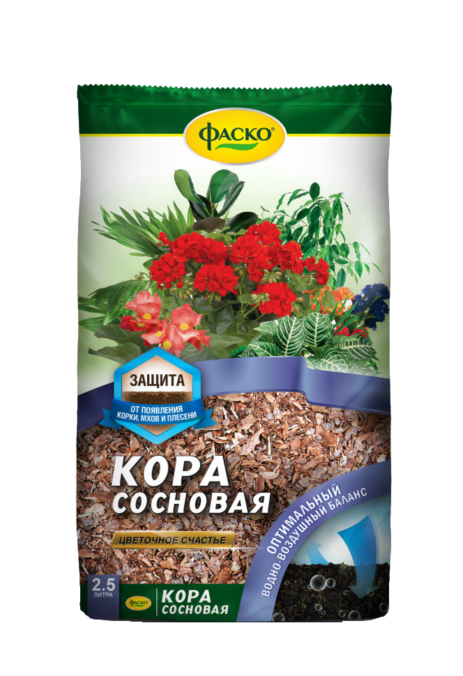 Кора "Цветочное счастье" 2,5 л ФАСКО - экологически чистый, абсолютно безопасный для человека и окружающей среды 100% природный материал. Применяется для мульчирования верхнего слоя почвы и для украшения всех видов комнатных растений (диффенбахий, кротонов, монстер, драцен, фатсий, юкк, кордилин, бересклета, марант, пальм, фикусов, филодендронов, сингониумов, панданусов, циперуса, хлорофитумов, традесканций, сциндапсусов, плющей, шефлеры и др.) и цветущих (гераней, антуриума, гибискуса, фуксии, бальзамина, амариллиса, жасмина, пассифлоры, калл, спатифиллума, цикломенов, пуансеттии, хризантемы, пахистахиса, абутилона, олеандра, примулы, афеландра, бегоний и др.) как дома, так и в офисе. Кора сосновая не содержит красителей, химических примесей, опила и стружки. Произведена по современной технологии механическим методом без использования химических реагентов.