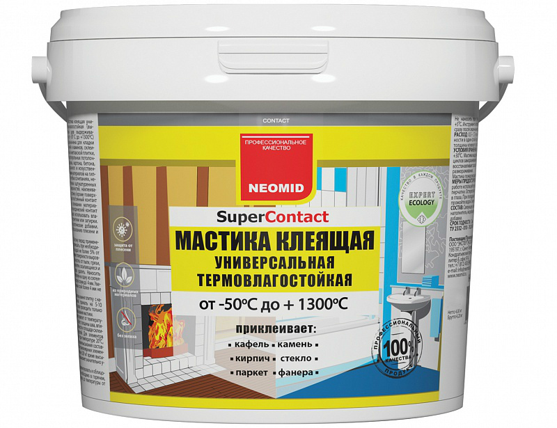 Мастика клеящая термостойкая универсальная Neomid SuperContact, 1,5 кг предназначена для кладки и облицовки печей и каминов, склеивания кафельной и метлахской плитки, стекла, пенополистирольных потолочных плиток, дерева, картона, бетона, кирпича, натурального и искусственного камня (кроме материалов на гипсовой основе) в любых сочетаниях, неглубокой шпатлевки оштукатуренных и бетонных поверхностей, наклеивания фанеры на стяжку (кроме поверхностей, имеющих постоянный контакт с водой). При склеивании материалов имеющих периодический контакт с водой, для швов использовать влагоустойчивые герметики или затирки. Содержит антисептические добавки. Препятствует образованию плесени и грибов.