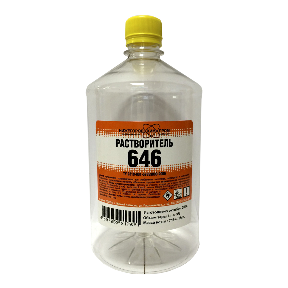 Растворитель 646 1 л представляет собой смеси летучих органических жидкостей: ароматических углеводородов, кетонов, спиртов и эфиров.
