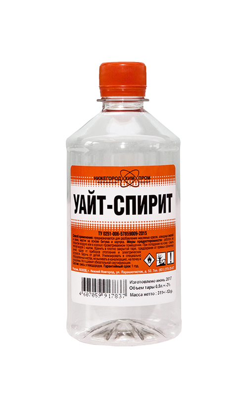 Растворитель "Уайт-спирит" 0,5 л представляет собой высококипящую фракцию бензина, применяется в лакокрасочной промышленности, в производстве олиф и других отраслях промышленности.