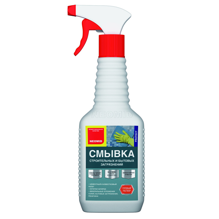 Смывка цементного налета НЕОМИД-560 распылитель 0,5 л применяется для удаления цементных, известковых и гипсовых загрязнений. Рекомендуется для очистки поверхности после строительных работ, в ходе которых использовались минеральные растворы, а также для удаления бытовых загрязнений с настенных и напольных керамических плиток, кирпича, раковин, ванн и других поверхностей (грязь, осадки и пятна, возникшие из содержащихся в воде минералов, ржавчины и т.п.).