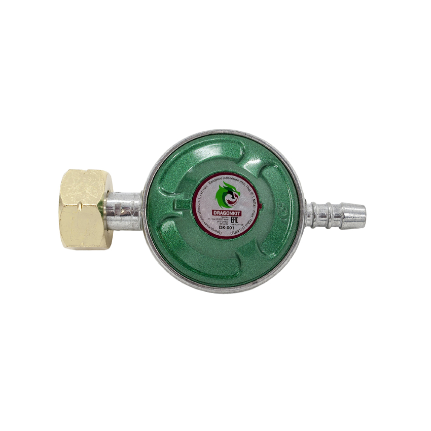 Регулятор давления газа Dragonkit, СНГ, DK-001 - традиционный бытовой регулятор давления для газовых баллонов («лягушка») с комбинированным типом соединения с вентилем (можно подключать как стальные и композитные баллоны с типом соединения СНГ, так и композитные баллоны с KLF соединением). На выходе штуцер под шланг 9 мм.