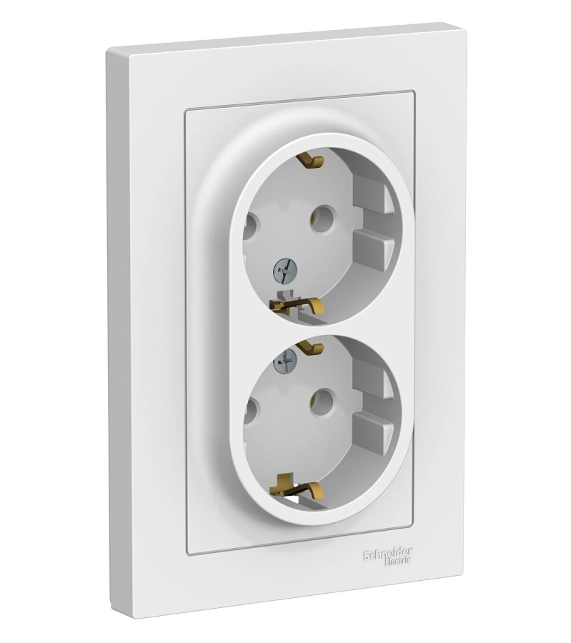 Розетка 2х2Р+Е двойная, с заземлением, белый Atlas ATN000124 используется для подключения электроприборов к силовой электрической сети.