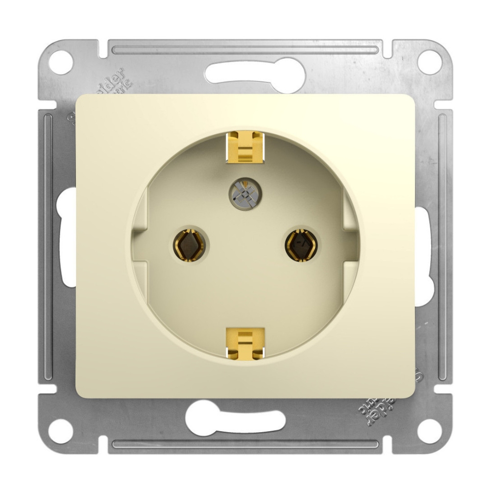 Розетка Schneider Electric, Glossa, с заземлением, бежевая, 2Р+E подходит для сетей 250 В, на ток 16 А. Заземляющий контакт обеспечивает дополнительную защиту от удара электрическим током. При наличии заземления электрический потенциал уходит в землю, защищая человека. Материал изготовления является стойким к УФ-излучению и появлению царапин.