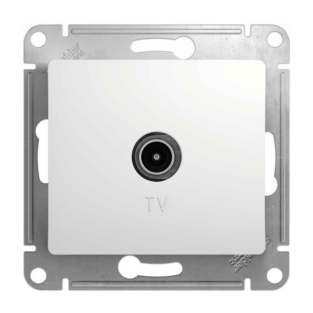 Розетка TV Schneider Electric, Glossa, коннектор, белая предназначена для подключения бытовой теле-, видео и радиоаппаратуры к антенному кабелю при внутренней установке в жилых, общественных и промышленных помещениях. Выполнена из материала PС+ASA, стойкого к УФ-излучению и появлению царапин.