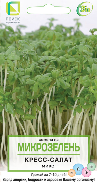Семена на Микрозелень Кресс-салат Микс, 5 гр. Сочные ростки кресс-салата имеют пикантный, слегка горьковатый пряный вкус, отдаленно напоминающий горчицу, их добавляют в салаты, супы и соусы, подают к мясным и рыбным блюдам, гарнирам и бутербродам. Микрозелень является источником витаминов группы В, витамина С, каротина, рутина, минеральных солей и йода. Обладает общеукрепляющим действием, улучшает пищеварение, работу щитовидной железы, сон и самочувствие, снижает артериальное давление. В состав входят семена кресс-салата: Забава, Темп.