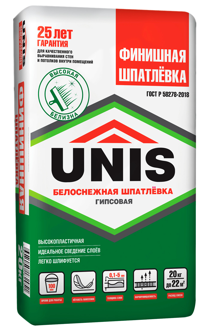 Шпатлевка гипсовая Unis Финишная - высокопластичная шпатлёвка на гипсовой основе для финишного тонкослойного идеально гладкого выравнивания поверхностей стен и потолков под последующую декоративную отделку. Особенно рекомендуется под окрашивание. Применяется внутри отапливаемых помещений с нормальной влажностью.
