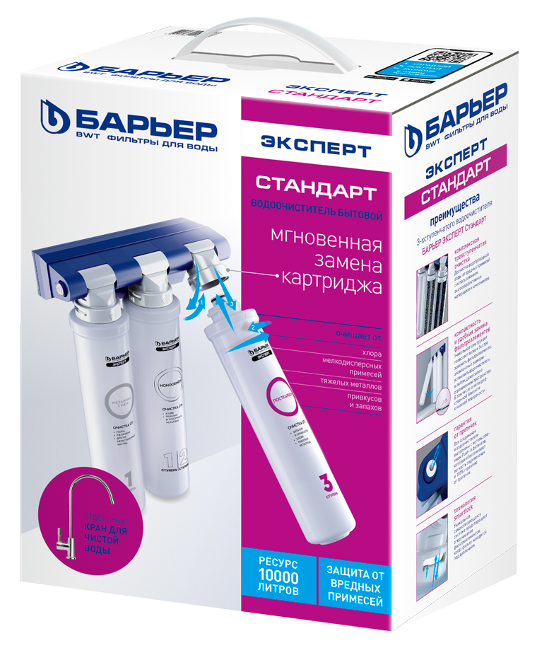 Фильтр под мойку для очистки воды БАРЬЕР ЭКСПЕРТ СТАНДАРТ - комплексная очистка водопроводной воды от всех основных содержащихся в ней вредных примесей. Быстрая замена картриджей без специальных инструментов.