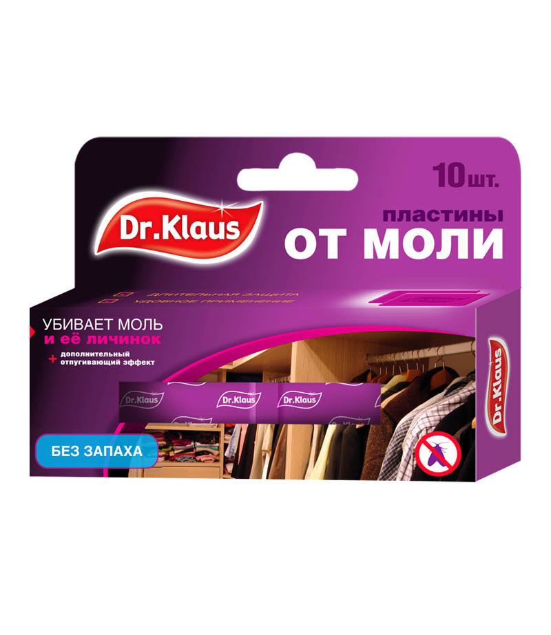 Пластины от моли Dr.Klaus 10 шт без запаха 03030041 - средство для защиты изделий из шерсти, натурального меха, верхней одежды, ковров. Уничтожает личинок, а не просто отпугивает моль. Именно личинки портят вещи. Длительная защита от 3-х месяцев ( в часто открываемых шкафах) - до 6-ти месяцев (внутри упакованных вещей).