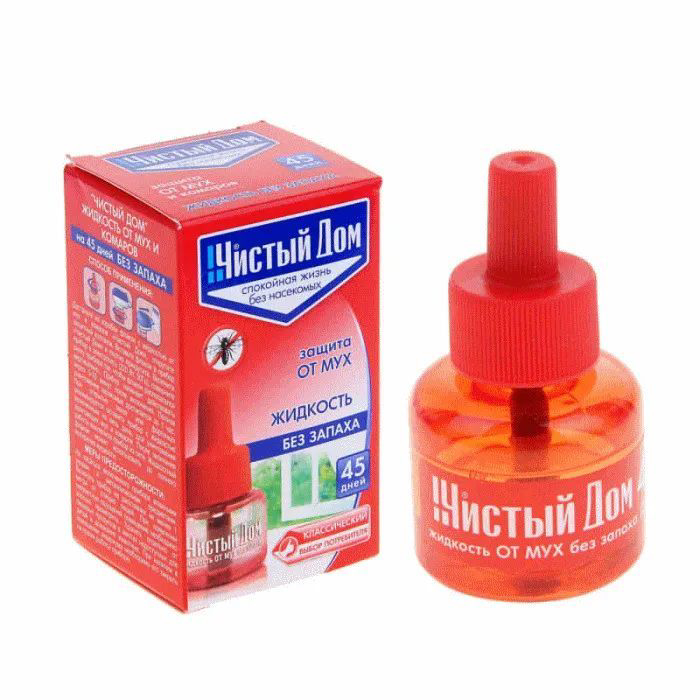 Жидкость от мух и комаров Чистый дом, 45 мл - удобное средство многоразового использования, эффективно защищает от мух и комаров. Безопасно для людей, животных и окружающей среды. Флакон рассчитан на 45 дней работы.