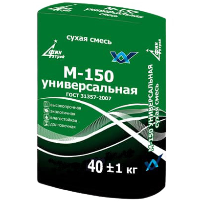 Сухая смесь универсальная М-150 ФинСтрой (ГОСТ), 40 кг предназначена для выполнения монтажных, кладочных, штукатурных и ремонтных работ снаружи и внутри помещений. Наносится на бетонные, цементно-известковые, цементно-песчаные, кирпичные основания.