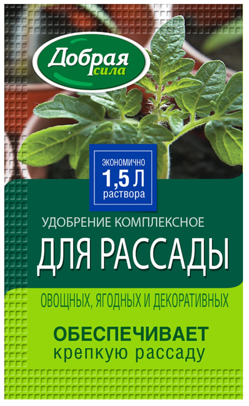 Удобрение для рассады Добрая сила, 10 мл обеспечивает крепкую, сильную и здоровую рассаду. Укрепляет корневую систему. Способствует будущему богатому урожаю. Высококонцентрированное органо-минеральное удобрение. Экономичный расход: 15 мл на 1,5 литра воды. После окончания срока годности удобрение не теряет своей агрономической ценности.