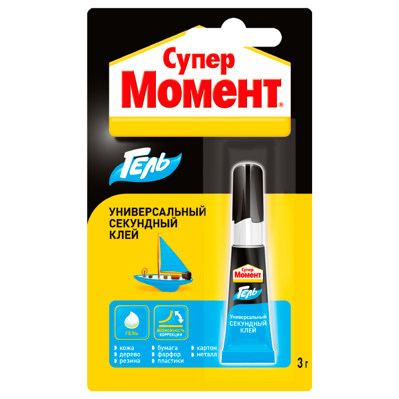 Супер-клей Момент, гель универсальный, 3 г предназначен для всех видов быстрых ремонтных работ в быту, в мастерской, в автомобиле, при конструировании моделей. Склеивает мгновенно. Мгновенно склеивает в любых сочетаниях фарфор, керамику, дерево, кожу, резину, металл, пробку, картон, большинство пластиков.Не растекается, не капает. Идеален для склеивания на вертикальных и пористых поверхностях. Не пригоден для полиэтилена, тефлона, стиропора и синтетических тканей.