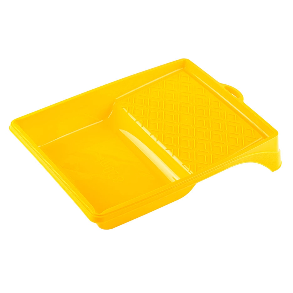 Ванночка малярная Акор, 37х34 см - это пластиковый поддон с рифленой поверхностью, по которой прокатывается малярный валик для удаления с его ворса излишка краски. Выполнена из пластмассы и имеет ножки для лучшей устойчивости. Рассчитана на большие объемы краски.