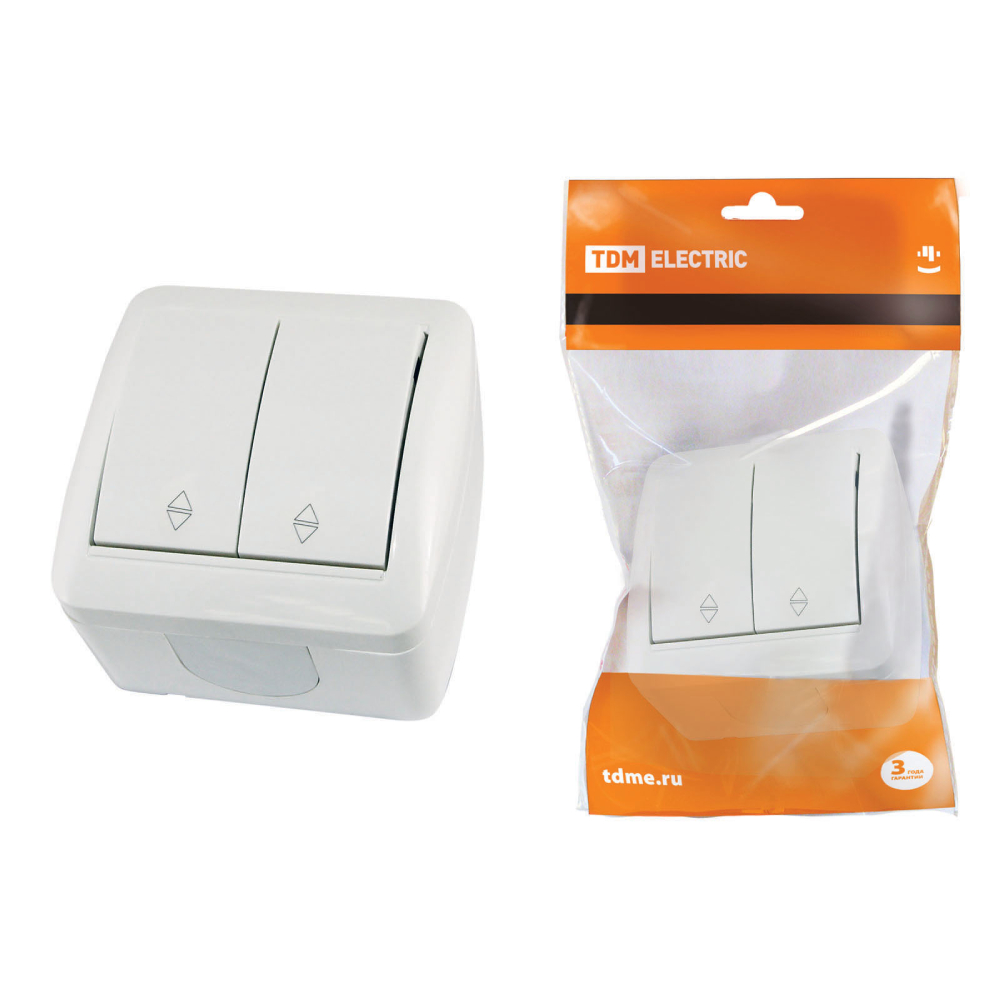 Переключатель TDM, Селигер, открытой установки, 2 клавишный, белый, 10А - подключение бытовых нагрузок к сети переменного тока и управление сетями освещения в условиях повышенной влажности и пылезагрязненности.