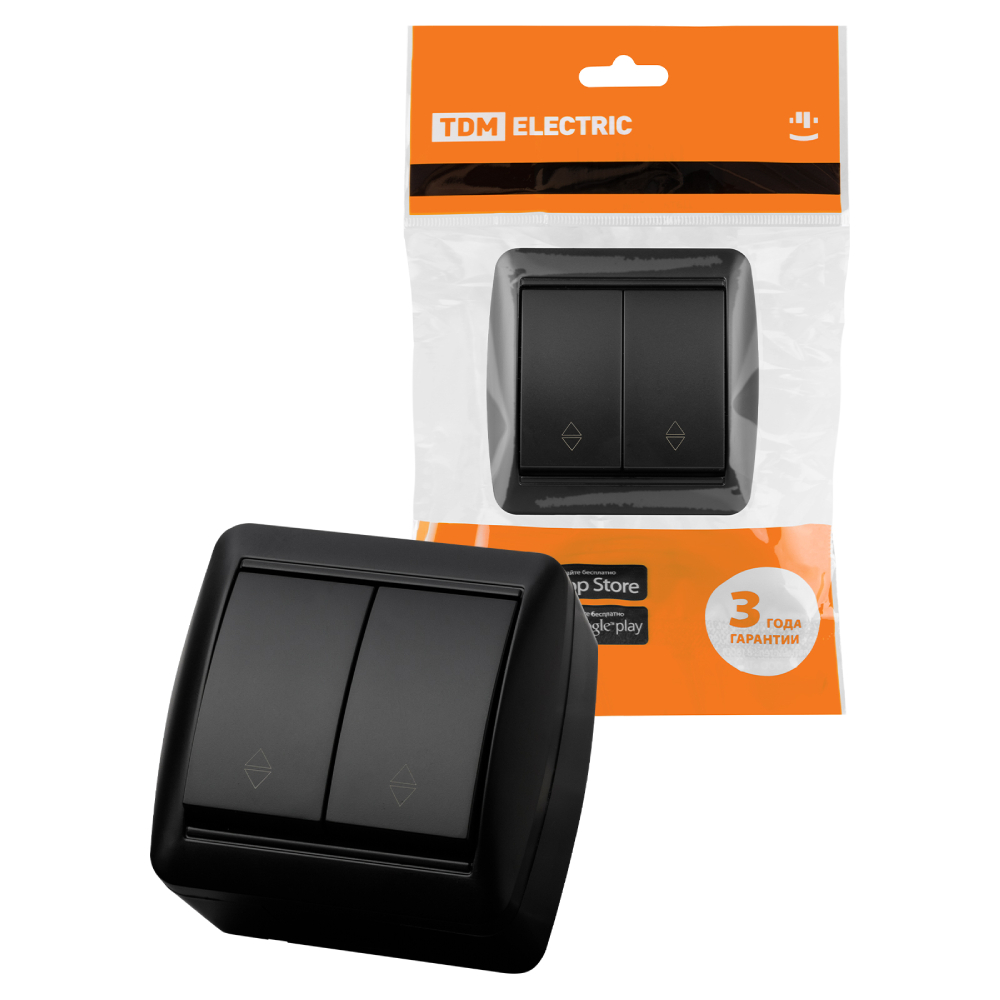Переключатель TDM, Селигер, открытой установки, 2 клавишный, графит, 10А - подключение бытовых нагрузок к сети переменного тока и управление сетями освещения в условиях повышенной влажности и пылезагрязненности.