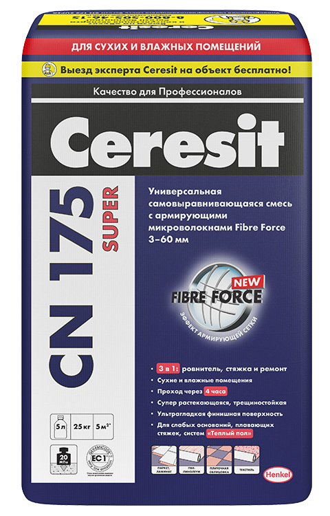 Универсальная самовыравнивающаяся смесь с армирующими микроволокнами Fibre Force (от 3 до 60 мм) Ceresit CN 175 Super предназначена для выравнивания пола под укладку покрытий (ПВХ, линолеума, ковролина, керамической плитки, ламината и др.), изготовления стяжек и ремонта дефектов оснований пола (трещин, выбоин и т.д.) в сухих помещениях с невысокими механическими нагрузками (жилых, бытовых, административных и т.п.). Предназначена как для ручного, так и для механизированного нанесения. За один проход смесь можно наносить слоем толщиной от 3 до 60 мм. В случае использования в качестве основания под приклейку паркета необходимо предусмотреть промежуточный слой из водостойкой фанеры толщиной не менее 12 мм.