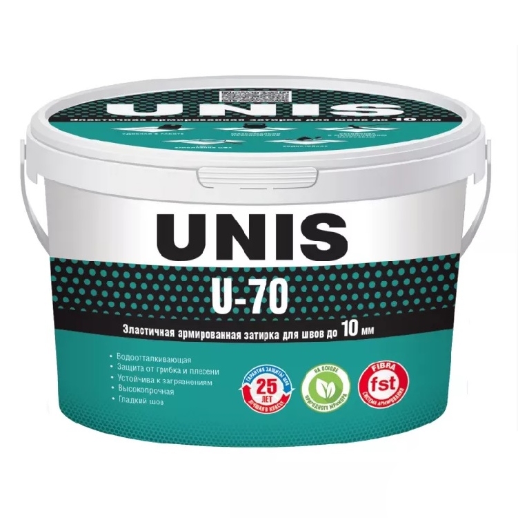 Затирка Unis U-70 применяется для заполнения межплиточных швов на полах и стенах внутри и снаружи помещений. Подходит для плитки любого типа: керамической плитки, клинкера, камня, керамогранита, мозаики. Рекомендуется к применению в помещениях с любым уровнем влажности, в том числе и при облицовке бассейнов. Подходит для использования в системе «Тёплый пол». Защищает от появления грибка, водорослей и плесени, устойчив к истиранию и ультрафиолету.