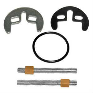 - Монтажный комплект. Такой набор содержит два уплотнителя (полушайбы) из резины, одну полушайбу в виде сделанной из металла подковы, одну (либо две) шпильки, а также гайку. Как правило, такой набор входит в комплектацию смесителя, но лучше приобрести уплотнитель большей толщины и прочности, в заводской комплект могут входить детали низкого качества.
