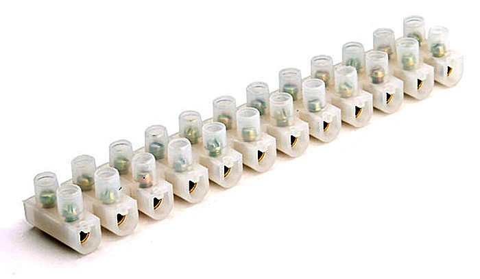 Представляют собой винтовые модели. Состоят из последовательного ряда гильз для соединения. Провода вставляются из разных сторон и зажимаются. Ряд клемм легко обрезается до нужного количества. Специалисты рекомендуют использовать полиэтиленовые модели для медных одножильных проводов.