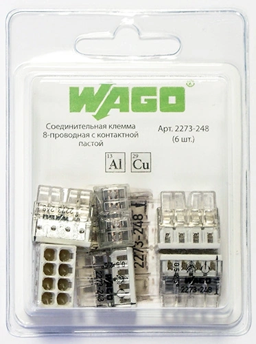 Отдельно хочется выделить клеммы Клемма 2273-248-6 WAGO 8х(0,5-2,5 мм²) с пастой для безопасного соединения медных и алюминиевых проводов, серый (упаковка 6 шт) (Артикул: ETM4277742)
