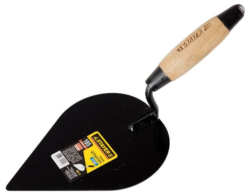 Инструмент сердцевидной формы показан для перемешивания, укладки, выравнивания раствора, кладки кирпича. Полотно выполнено из стали, имеет длину 185 миллиметров. Рукоятка изготовлена из дерева.