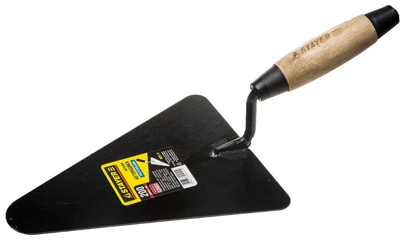 Инструмент с шириной полотна 200 миллиметров изготовлен из стали, имеет деревянную ручку. Назначение – выполнение кирпичной кладки, укладка и выравнивание раствора, удаление излишков. Кельма каменщика также применяется при штукатурно-отделочных работах.