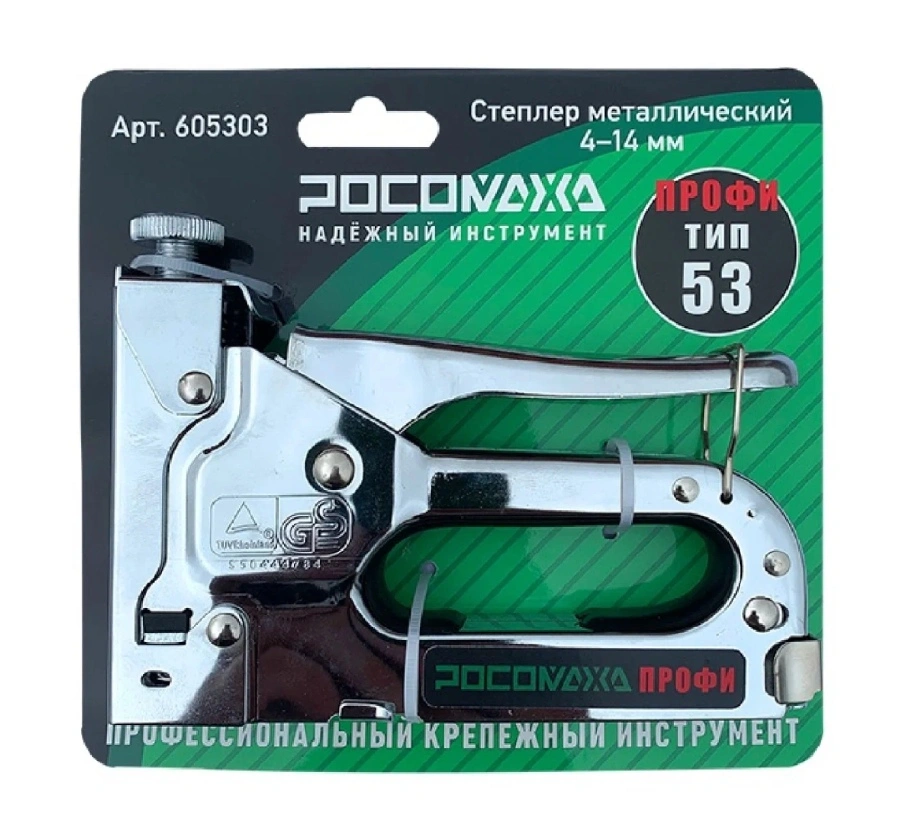 Степлер для скоб 4-14 мм, тип 53, «РОСОМАХА» 605303 в стальном корпусе, характеризующееся долгим сроком службы. Используется для забивания скоб 53-го типа в твердые и мягкие породы дерева.