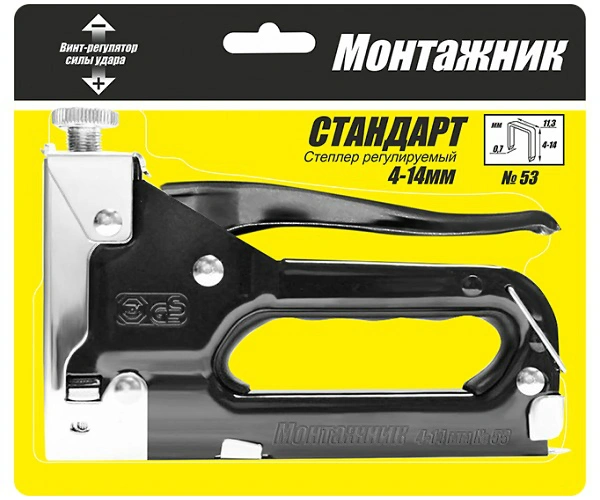 Например, степлер для скоб 4-14х0,7 мм «Монтажник» Стандарт (арт: 600302) с регулировкой удара