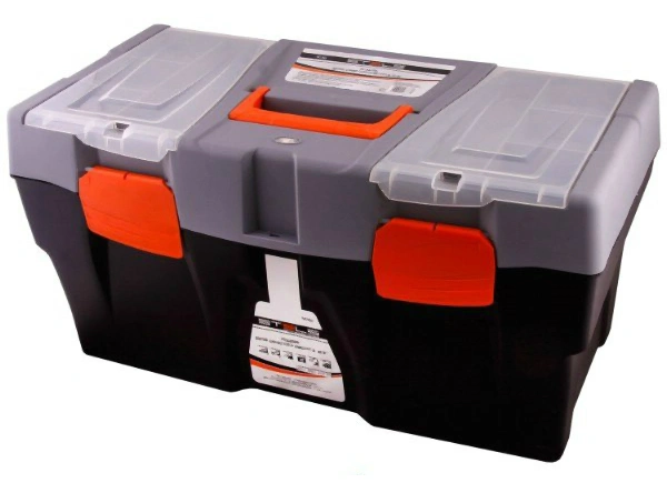 Ящик для инструмента STELS, пластиковый, усиленный. Противостоит воздействию влаги. Оснащен пластиковой ручкой, пластмассовыми замками, резиновым ковриком внутри.